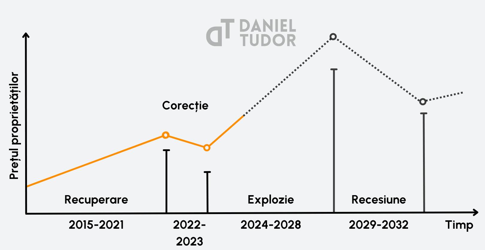 A 4-a lecție: Din vârf prețurile nu scad la minimele precedente, ci la prețurile de după faza de corecție. Posibil să ne simțim norocoși dacă peste 6-7 ani mai avem oportunitatea să cumpărăm la prețurile din 2024-2025.